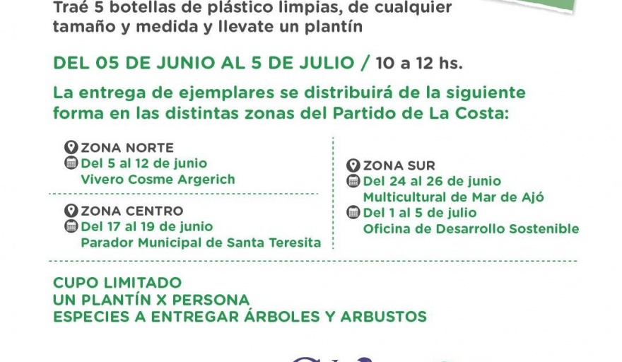Durante este período, del 17 al 19 de junio, los vecinos podrán llevar 5 botellas de plástico limpias a cambio de un plantín al Parador Municipal de Santa Teresita, ubicado en Costanera y Calle 35, de 10.00 a 12.00 horas.