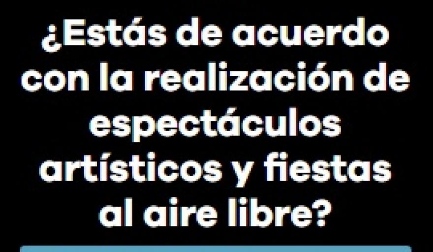 La pregunta es ¿está de acuerdo con la realización de espectáculos y fiestas al aire libre? y las opciones de respuesta tres: 1.- Si, estoy de acuerdo; 2.- Espectáculos si, fiestas no; 3:- No, no estoy de acuerdo.