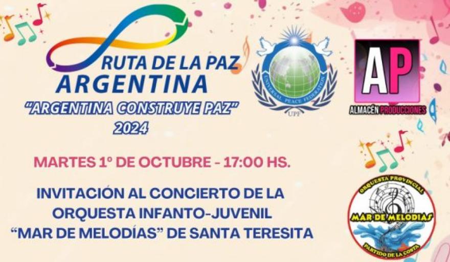 El martes 1º de octubre, a partir de las 17:00, se llevará a cabo un concierto de la Orquesta Infanto-Juvenil “Mar de Melodías” en el Centro Cultural “Lo de Juan y Emi”, ubicado en Calle 31 Nº 737 de Santa Teresita. Este evento se realiza en beneficio del Centro Misional “San Francisco de Asís”, que forma parte de la Asociación Civil Marana-Tha, y está enmarcado en la campaña “Argentina construye Paz”.