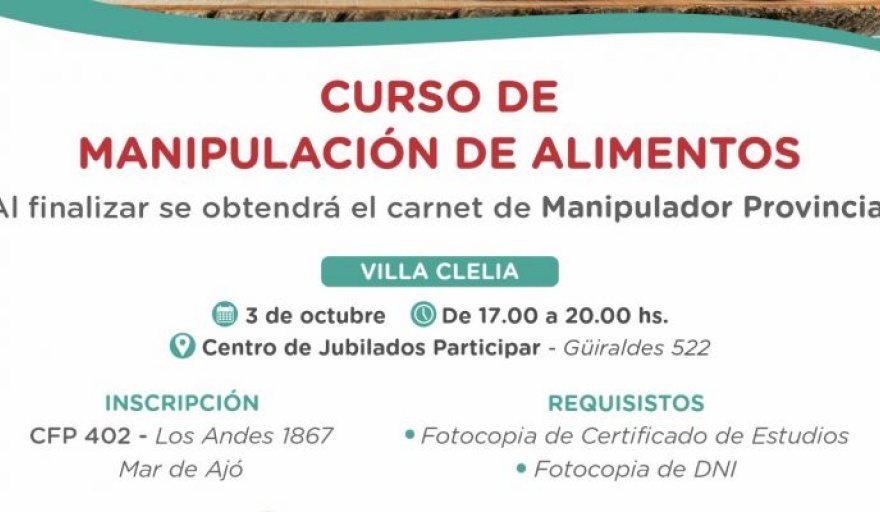 El próximo jueves 3 de octubre, se llevará a cabo un curso de manipulación de alimentos en Villa Clelia, con el objetivo de capacitar a los participantes en las mejores prácticas de seguridad alimentaria. La capacitación se realizará de 17:00 a 20:00 en el Centro de Jubilados «Participar», ubicado en Güiraldes 522.