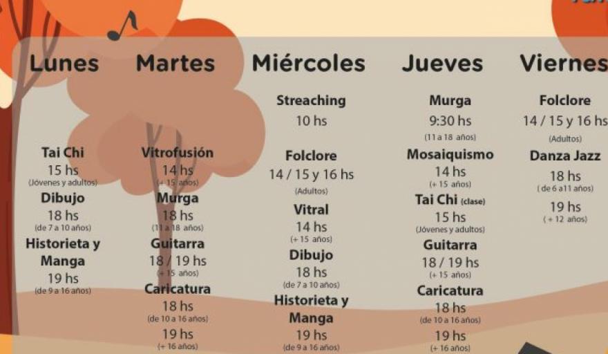 La propuesta incluye una variada oferta educativa para todas las edades, con disciplinas como Tai Chi, dibujo, historieta y manga, vitrofusión, murga, guitarra, folclore, caricatura, danza jazz y un taller literario.
