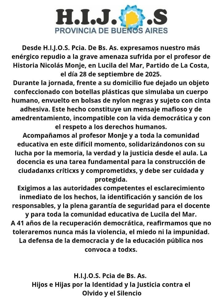 Se trata de un episodio que despertó gran preocupación entre vecinos y colegas, quienes remarcaron la necesidad de repudiar cualquier práctica de intimidación que atente contra la democracia, la educación pública y la defensa de los derechos humanos.