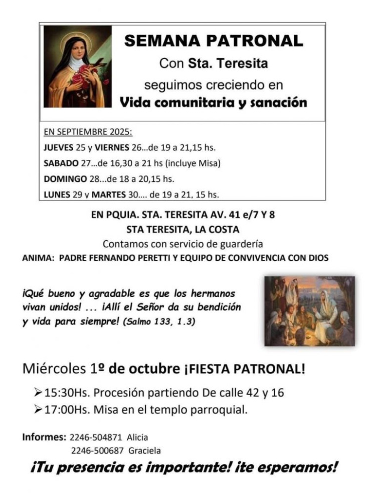 Como cada año, la Parroquia de Santa Teresita, ubicada en calle 41 entre 7 y 8, invita a celebrar su tradicional fiesta patronal. Bajo la guía del Padre Fernando Peretti y el grupo “Convivencia con Dios”, se convoca a toda la comunidad a sumarse a las actividades programadas.
