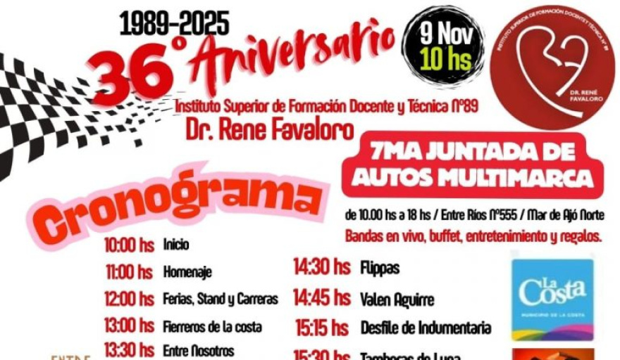 El Instituto Superior de Formación Docente y Técnica Nº 89 “Dr. René Favaloro” celebra sus 36 años de trayectoria educativa y lo hará, como ya es tradición, con una nueva edición de la Juntada de Autos Multimarca, organizada en conjunto con la Asociación de Fierreros de La Costa.