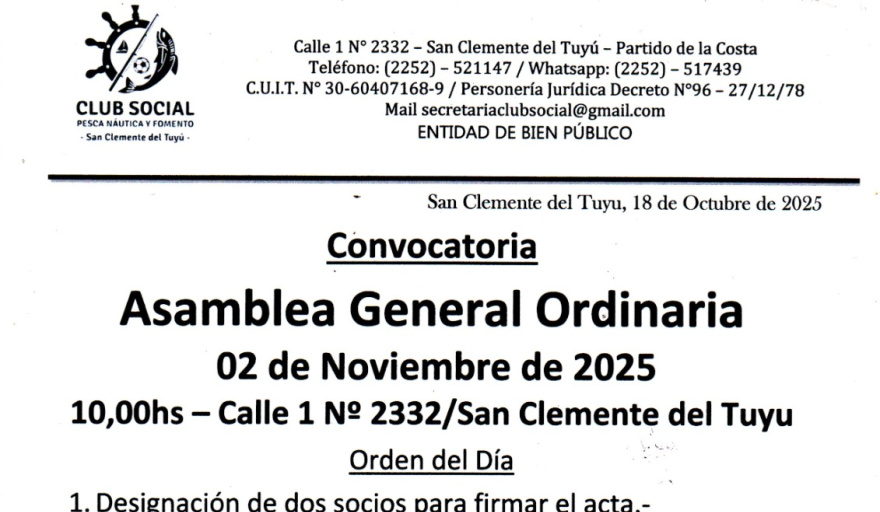 El Club Social de Pesca Náutica y Fomento de San Clemente del Tuyú informó que el sábado 2 de noviembre de 2025, a las 10:00 horas, se llevará a cabo la Asamblea General Ordinaria en su sede social, situada en Calle 1 N° 2332, San Clemente del Tuyú.