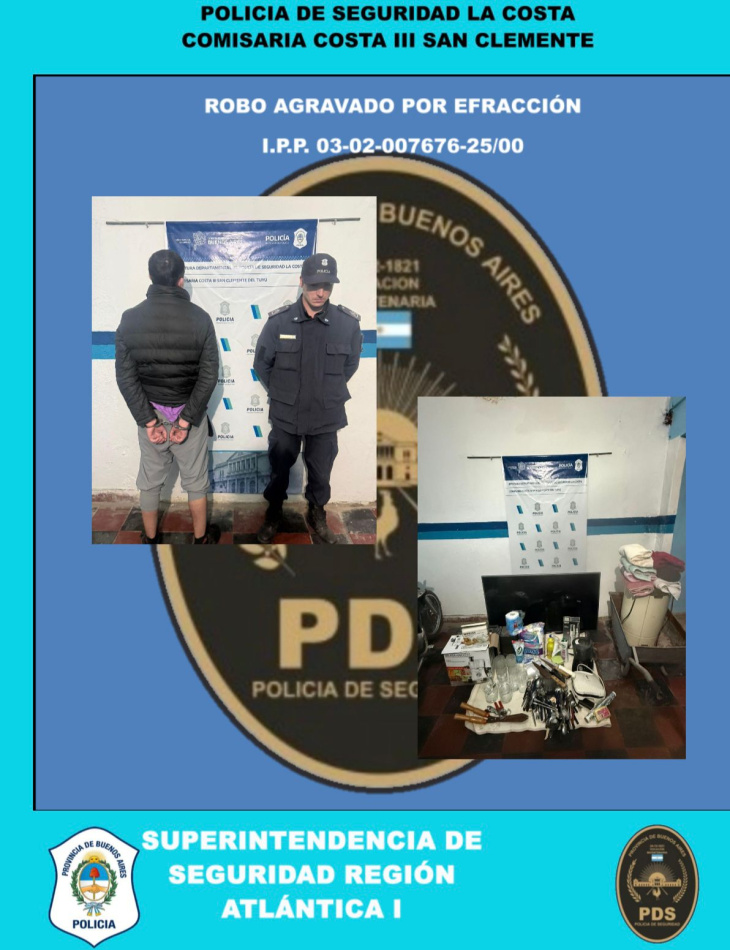 En un rápido accionar policial, y bajo la intervención de la Unidad Funcional de Instrucción y Juicio N°2 de Mar del Tuyú, se logró la detención de un sujeto acusado de robo agravado por efracción.