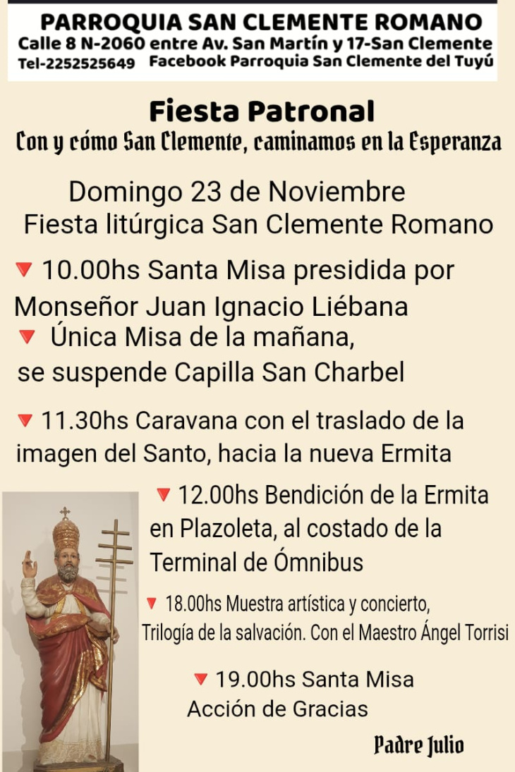 El punto culminante llegará el domingo 23 de noviembre, cuando se realice la Fiesta Litúrgica de San Clemente Romano. La jornada comenzará a las 10.00 con la Santa Misa presidida por Monseñor Juan Ignacio Liébana, siendo la única misa de la mañana. Seguidamente, a las 11.30 partirá una caravana con la imagen del santo hacia la nueva ermita ubicada en la plazoleta junto a la Terminal de Ómnibus, donde se realizará la bendición del espacio a las 12.00.