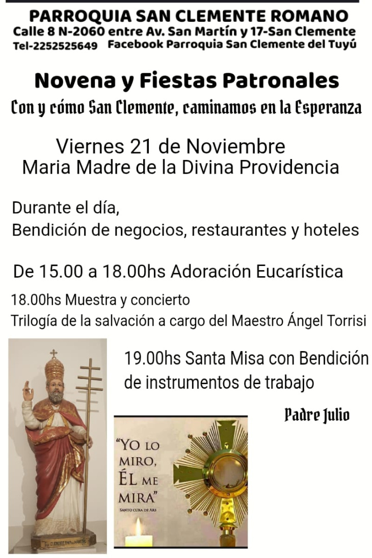 La comunidad católica de San Clemente del Tuyú ya se encuentra celebrando las Fiestas Patronales en honor a San Clemente Romano, patrono de la ciudad. Las celebraciones comenzaron el 18 de noviembre con una serie de misas y encuentros de oración en distintas ermitas y capillas del Partido de La Costa.