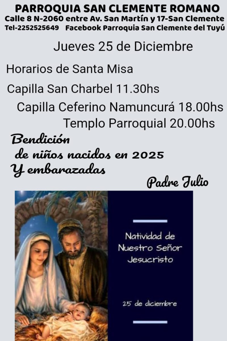 El jueves 25 de diciembre, solemnidad de la Natividad de Nuestro Señor Jesucristo, se celebrarán misas en distintos horarios: a las 11.30 en la Capilla San Charbel, a las 18 en la Capilla Ceferino Namuncurá y a las 20 en el templo parroquial. Durante las celebraciones se realizará una bendición especial para los niños nacidos en 2025 y para mujeres embarazadas.