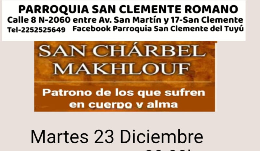 El martes 23 de diciembre a las 20 horas se celebrará una misa en honor a San Charbel Makhlouf, patrono de quienes sufren en cuerpo y alma. Durante la ceremonia, que tendrá lugar en el templo parroquial, se realizará la unción con el aceite milagroso del santo. La celebración será presidida por el padre Julio.