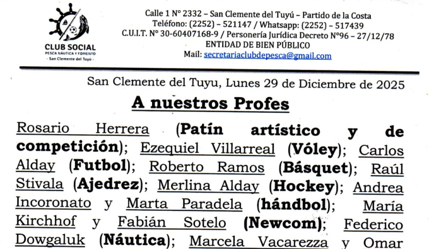 El Club Social de Pesca, Náutica y Fomento de San Clemente del Tuyú expresó públicamente su agradecimiento a los profesores y profesoras que formaron parte de la institución a lo largo de 2025, reconociendo el esfuerzo diario y el compromiso sostenido que permitió no solo mantener, sino también hacer crecer cada una de las disciplinas deportivas y culturales del club.