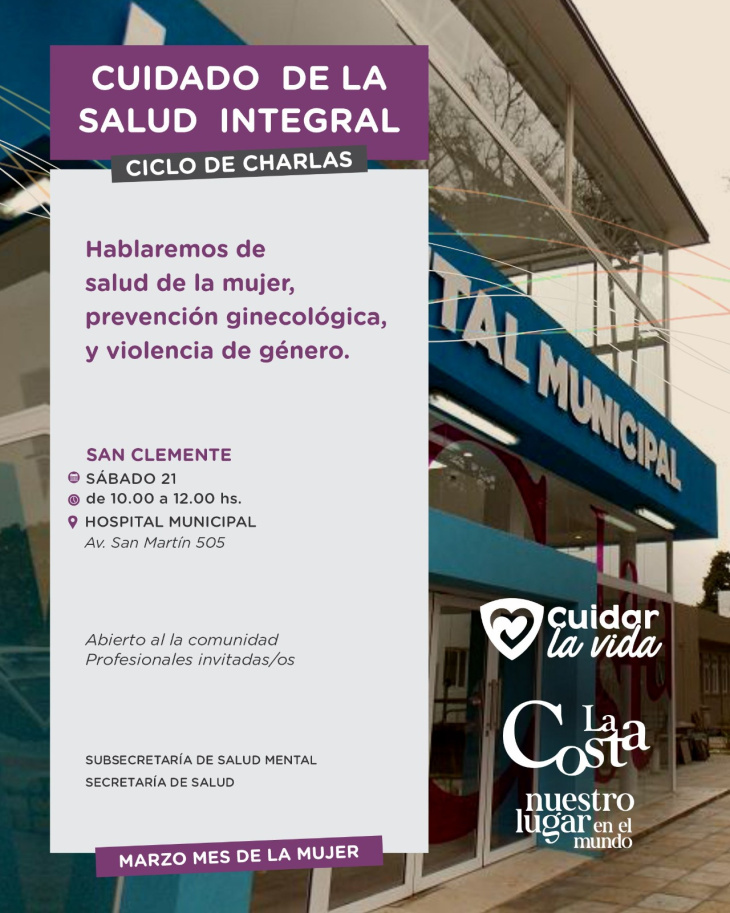 El Hospital Municipal de San Clemente pondrá en marcha un ciclo de charlas abiertas a la comunidad sobre cuidado de la salud integral. La primera jornada se realizará el sábado 21 de marzo, de 10.00 a 12.00, en el establecimiento ubicado en Avenida San Martín 505.