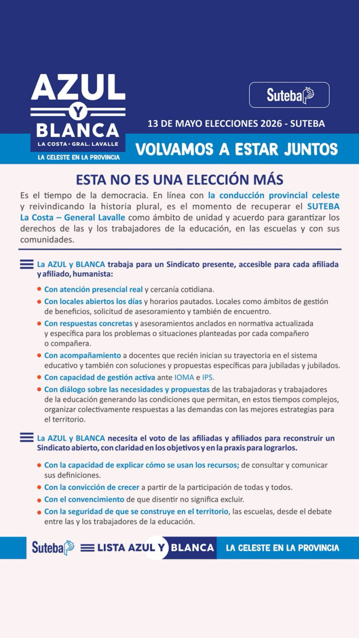 En el marco del calendario de elecciones gremiales que se desarrollan en distintos sindicatos vinculados al sistema educativo, la seccional La Costa–General Lavalle del SUTEBA se prepara para votar a sus autoridades el próximo 13 de mayo.