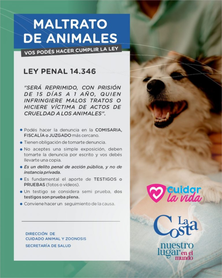 La iniciativa se desarrolla en el marco del programa “Cuidar la Vida” y busca visibilizar el alcance de la Ley Penal Nº 14.346, que establece sanciones de prisión para quienes incurran en actos de crueldad o maltrato hacia animales.