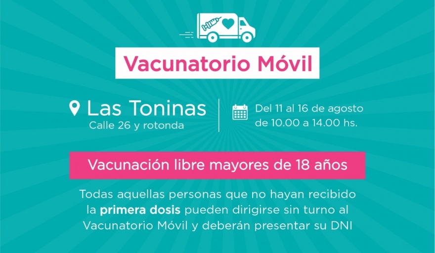 Del miércoles 11 al lunes 16, en el horario de 10.00 a 14.00, el vacunatorio móvil estará aplicando primeras dosis en la Plaza Prefectura Naval Argentina, ubicada en Av. 26 y la rotonda en Las Toninas. Se deberá concurrir con DNI.