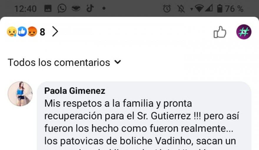 Según la versión de Paola Giménez, publicada en su perfil de la red social Facebook “los patovicas del boliche Vadinho, sacan un menor de edad llamado Alain Nicolás Laguna, a los golpes, lo tiran de las escaleras, una vez que cae en la vereda el Beto Gutiérrez (el efectivo policial que se encuentra internado) , lo manotea de los pelos y le empieza a dar golpes de puño hasta que lo deja inconsciente, lo levanta de los pies y lo arrastra hacia el móvil policial, donde la cabeza del chico arrastra sobre la vereda y asfalto”, detalla la supuesta testigo del episodio.