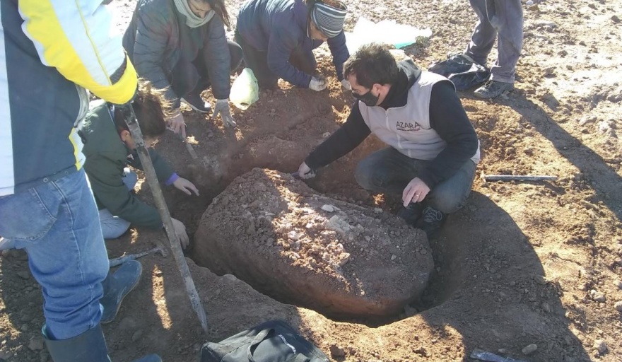 A esto le sumaron que “en este caso en particular se han hallado junto a los restos óseos, centenares de pequeños huesitos del tamaño de garbanzos, los cuales formaron un escudo flexible debajo de la piel de estos animales, que los defendía de los predadores o de sus propios congéneres, ya que estaban provistos de grandes y agudas garras. Debido a que los restos han sido extraídos dentro de bloques de terreno aún no se pudo establecer exactamente la especie, pero se tiene alguna idea. Hay que recordar que las tareas de limpieza en el laboratorio son bastante arduas, especialmente cuando se trata de material muy frágil como en este caso”.
