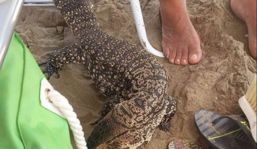 En medio de gran cantidad de turistas que estaban presentes en la playa de Santa Teresita, sorprendió la presencia de un lagarto overo.