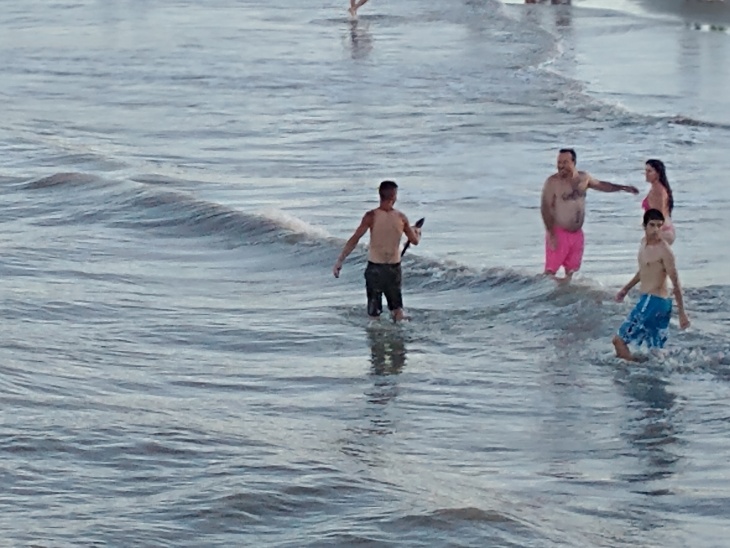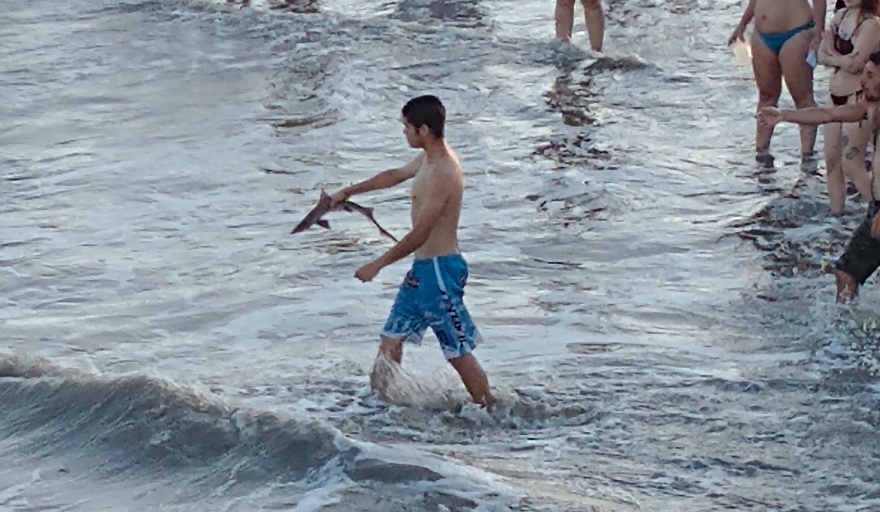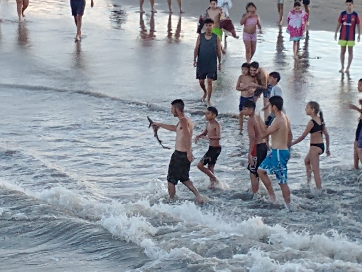 Gente y más gente se agrupaba en la playa lindera al muelle de pesca. Los bañistas corrían hacia la rompiente y volvían a la playa para luego volver a internarse en el agua. La curiosidad acercaba gente de playas vecinas y se podía intuir peleas y discusiones. Se veía gente gesticulando y señalando el mar, cuando de pronto un joven sacó un pez de unos cincuenta centímetros de largo y una señora se lo quitó y lo revoleó al mar. Parte de los curiosos y curiosas que se encontaban en el lugar, lejos de entender la buena actitud de devolver el pez al agua comenzó a increparla: "lo vas a matar! pobrecito!. "Cómo lo vas a tirar así", le gritaba otra joven exaltada a la mujer, sin comprender que la actitud y violencia al arrojar el pez seguramente se debía a una situación de miedo y querer desprenderse rápidamente del pequeño tiburón.